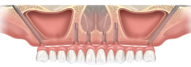 上顎の骨が少なくなってしまった方で、通常のインプラント治療ができないといわれた患者さまにも対応できる頬骨(ザイゴマ)にインプラントを埋入するインプラント治療です。通常はインプラントを顎の骨に埋入しますが、顎の骨が薄く、インプラントの埋入するのが難しい患者さまもいらっしゃいます。ザイゴマインプラントは頬骨にインプラントを埋入することで、オールオンフォーと同様に手術した当日に固定式の仮歯を装着する治療です。